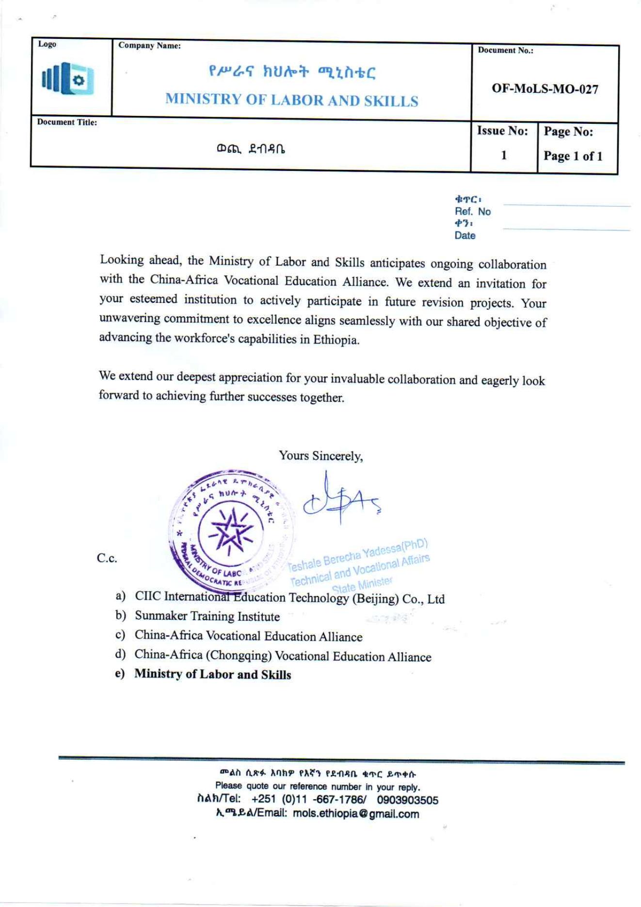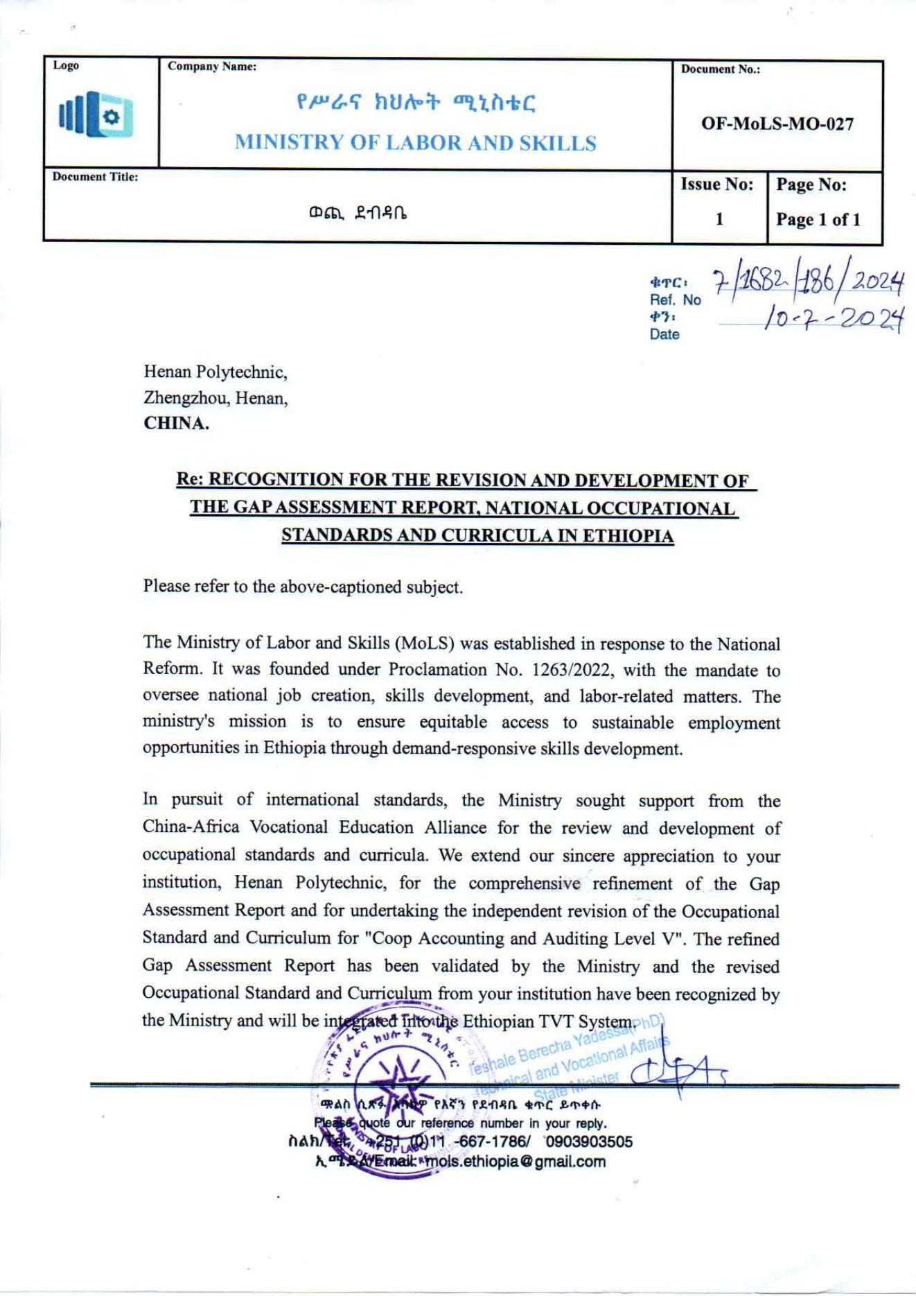 7月29日,中非职业教育联盟公布了第一批“埃塞俄比亚国家职业标准开发项目”认证清单。其中,由河职财经管理学院主导开发的合作社会计与审计技术员/工程师V级国家职业标准成功通过埃塞俄比亚劳动与技能部的审核,获得官方认证,并正式被纳入埃塞俄比亚国家职业教育体系。此次职业标准的修订旨在提升埃塞俄比亚会计和审计行业的专业水平,确保其与国际标准接轨。同时,这也充分展示了河职财经管理学院的专业实力。