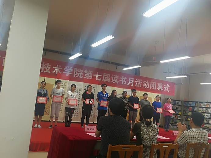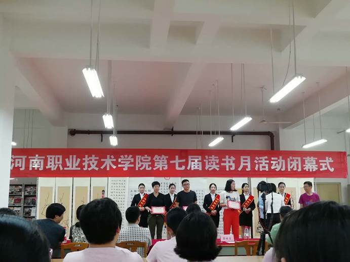 5月17日下午,由图书馆和校团委联合主办的“河南职业技术学院第七届读书月活动”闭幕式在图书馆三楼现刊阅览室举行。校领导李桂贞,邵芙蓉和田华出席了闭幕式。商学院老师:任秀娟,学生:徐方,孙园园,王银慧在学院第七届读书月活动中被评为读书达人,由校领导为任秀娟老师及三名学生颁发荣誉证书,并合影留念。
