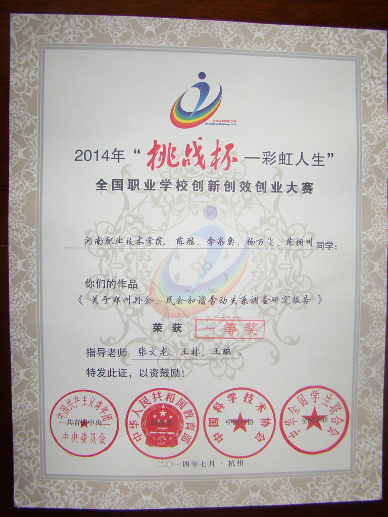 本届竞赛以“同圆中国梦想,共创多彩人生”为主题。自今年3月启动以来,共有来自全国600余所职业院校的四万余名学生参与。复赛共收到来自全国31个省份的894件参赛作品,最终确定349件作品入围决赛,其中中职院校作品146件,高职院校作品203件。决赛期间,经过秘密答辩、现场问辩等环节,我系张文龙、王林两位老师指导的陈胜、李泉奕、杨万飞和陈相州等四名学生,携带作品《关于郑州外企、民企和谐劳动关系调查报告研究》获得一等奖。