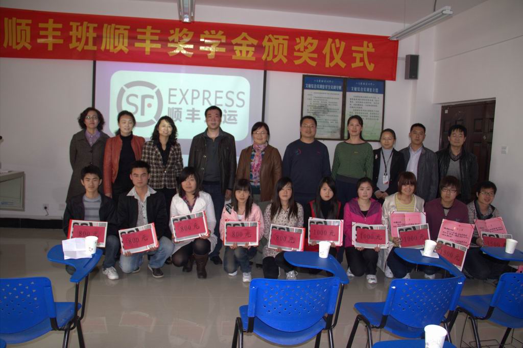 2009年9月,学院工商管理系和河南顺丰速运有限公司本着相互支持、共同发展、联合办班、共同培养的原则成立了“顺丰班”,2010年10月校企双方共同成立了河南顺丰速运有限公司龙子湖大学城分部,为该特色班学生提供了顶岗实训,实现与企业岗位需求的无缝对接,使学生坐上理论学习、技能培训、顶岗实习到就业的直通车,截至2012年3月,“顺丰班”共向该公司输送了80余名优秀毕业生。为激励特色班学生在德智等方面更上一个台阶,河南顺丰速运有限公司设置10000元奖学金,并同该系依据学生一学年的综合素质考评结果,以特色班30%左右的比例,双方共同确定物流091班康冬雪等10名学生获得“顺丰班”企业一、二、三等奖学金。颁奖仪式上,河南顺丰速运有限公司侯东亮经理宣布获奖学生名单,校企双方领导共同为获奖学生颁奖。接着赵杰经理和康冬雪同学分别代表企业和获奖学生发言。最后,肖珑副院长致答谢总结,肖院长肯定了该系校企合作所取得的成就,并代表学院对顺丰公司表示感谢,同时