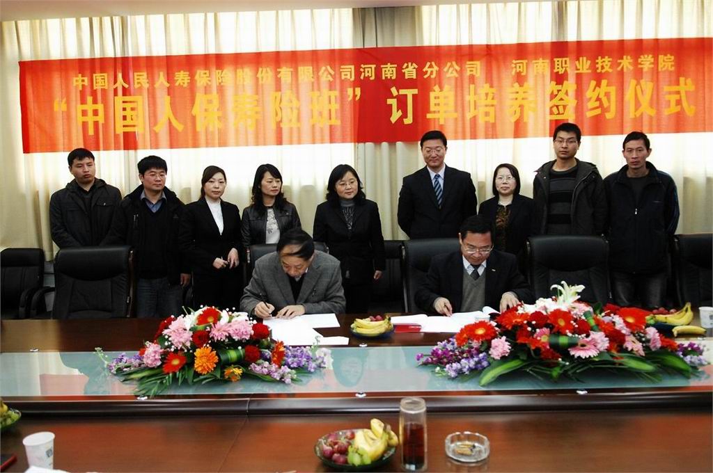 中国人民人寿保险股份有限公司河南省分公司总经理助理常国民介绍了公司发展历程,他说,公司订单培养人才,有利于企业的持续、稳定发展。希望校企双方在教学场地、学生管理、师资配备等方面,资源共享、互利共赢。公司负责学生二年级上、下学期,三年级上学期(共三个学期)在校学习规定课程的同时,提供量身订制的保险专业课程,在大三下学期进行市场开拓实习,并安排专职人员进行管理和指导。双方展望了“中国人保寿险班”发展前景,并就下一步订单工作的具体展开进行了讨论。