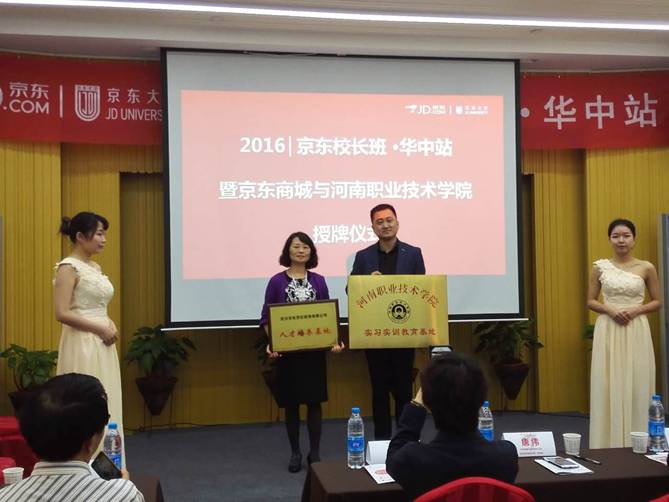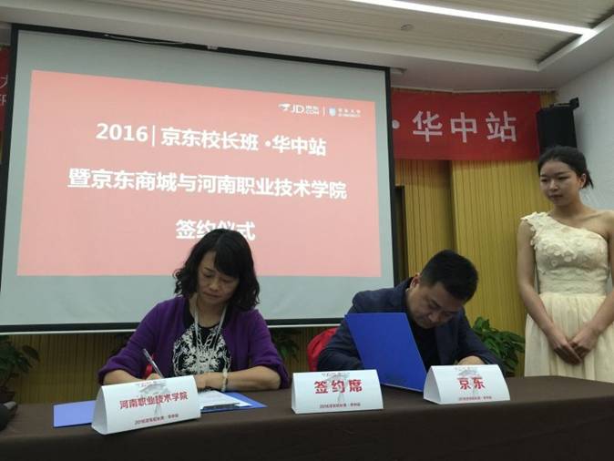 4月21日-22日,“共创、共建、共赢——2016京东校长班•华中站”在武汉举行,来自华东交通大学、武汉工程大学、江西理工大学、河南职业技术学院等26所高校的领导和老师参加了京东校长班。我院工商管理系万久玲主任代表学院与京东商城签订校企合作协议,并代表签约院校讲话。我院与京东的签约授牌意味着双方合作开始了深度融合的新阶段。