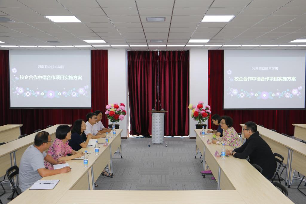 北京思威普智业投资顾问有限公司董事长梁薇女士和中德双元教育中心校长李超首先介绍了双元教育的发展历程及在国内的运行情况,指出中德双元教育并不是简单的移植德国教育模式,而是通过学习体系、教学模式、知识结构等方面的的改革,根据实际工作情境和流程,依托学习领域设计和互联网,经过本土化再造打造最适合中国国情和长远发展的职业教育。随后,考察团成员参观了该公司录播、情景模拟等现代化的教学场地。最后,校企双方就教学系统使用、学生选拔、教学模式、学生就业等合作细节进行了深入探讨。