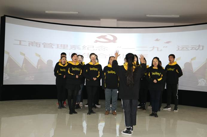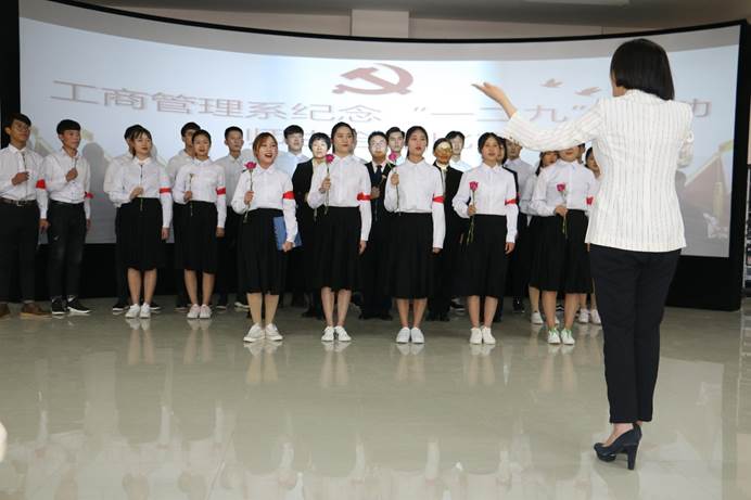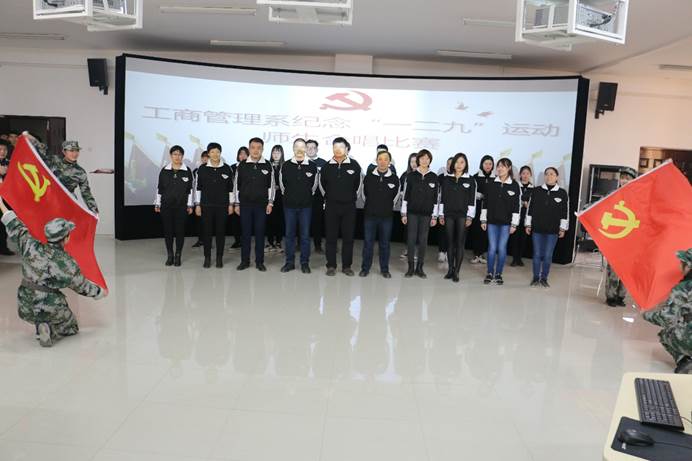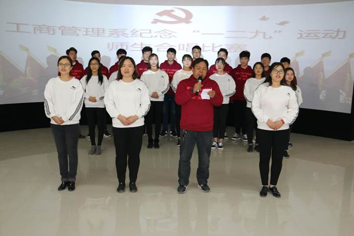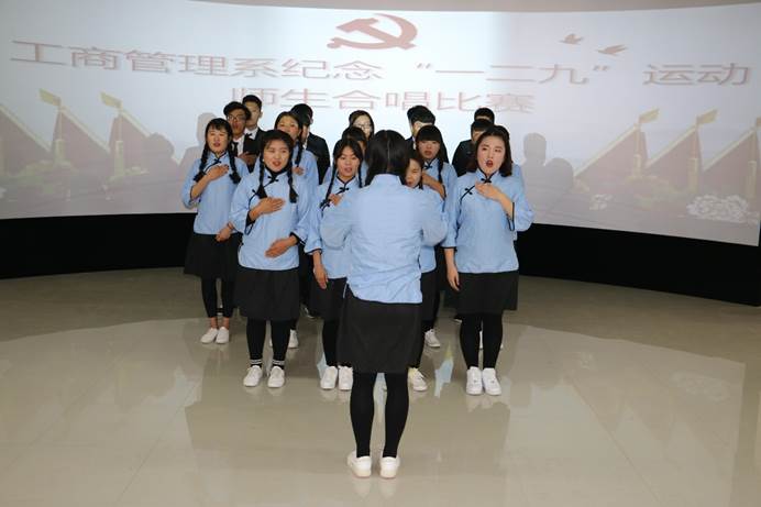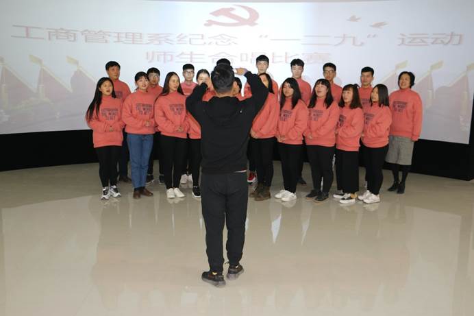 为纪念一二·九爱国运动82周年,11月30日下午,工商管理系纪念“一二·九”运动师生红歌合唱比赛在该系实训室隆重举行, 8支参赛队伍为党献唱红歌。