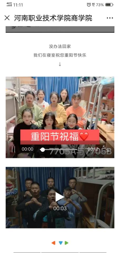 本次活动秉承“爱心构和谐,青春暖人心”的理念,通过宣传重阳节的意义,弘扬中华民族尊老爱老的传统美德,组织各班级召开一次主题班会,宣传孝亲敬老传统美德和孝道文化,倡导学生在重阳节这一天,向自己的爷爷、奶奶、外公、外婆送一份小礼物,祝贺他们节日快乐、身体健康,树立学生的爱老敬老意识。鼓励学生们通过短视频,书信,微信等方式,给家人、老人送祝福给他们带去温暖。一个个视频,一封封书信,一个个问候!都是学生们满满的爱!