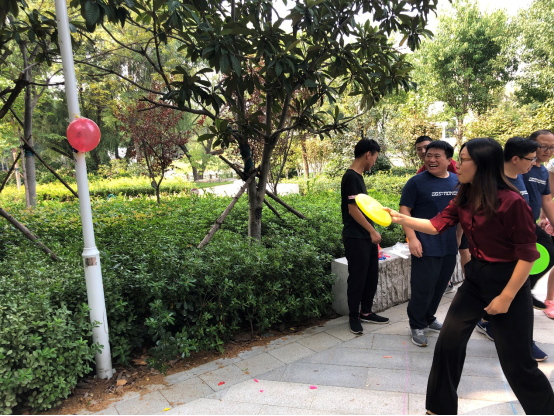 此次比赛活动由商学院领导担任评委,全院按教研室及行政部门共分为7组参赛队,每队6至8人。比赛要求首先以掷飞盘为传递方式进行接力,如果发生掉落必须在该环节捡起后重新飞掷,随后待小组最后一人接到飞盘后,在2米远的距离投掷飞盘击破固定在柱子上的气球,最后统计全程所用时间,最短者获胜。