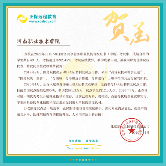 日前,从1+X评价组织传来消息,我校商学院学生在11月7日举办的1+X财务共享服务职业技能等级证书(中级)考试中,各项指标在所有参加考试的院校中居于前列,我校再次被评为优秀院校代表。