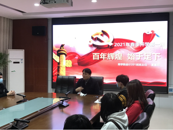 3月18日,校工会主席夏喜利同志走进2020级会计201班,给该班上了“百年辉煌,始于足下” 2021 年春季开学思想政治教育第一课。
