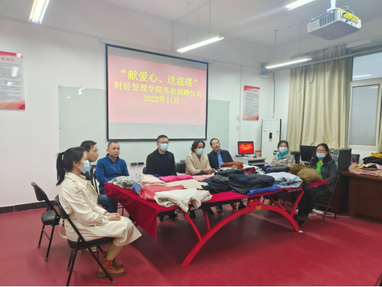 随着天气逐渐变冷,同时由于疫情的原因,既要保证学校疫情防控的安全稳定,又要保证学生能在学校温暖过冬, 2022年11月11日,财经管理学院在行政楼518举行了冬衣捐赠活动,财经管理学院院长窦雪霞、党总支书记吴玉刚、副书记余湾以及相关老师参加了此次活动。