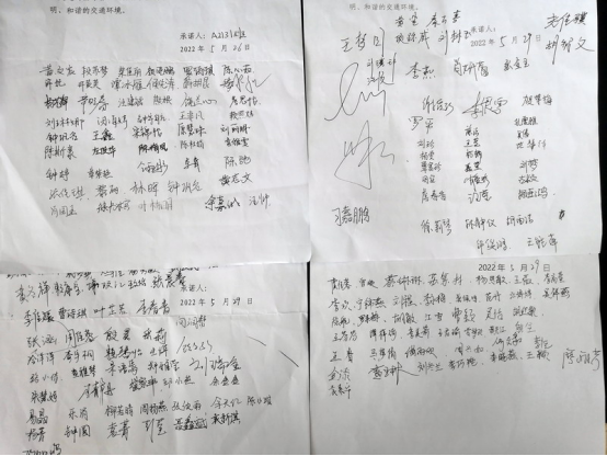 主题班会上,各班级集中收看了文明交通视频宣传片,传达学习了《河南职业技术学院关于开展文明交通专项整治工作的通知》精神,集中学习了《郑州市市民文明出行倡议书》、《郑州市市文明交通公约》,全体同学共同发起文明交通倡议,并签署了师生文明出行承诺书,郑重承诺:从自我做起,自觉遵守交通法规,争做文明交通的倡导者、践行者和宣传者。
