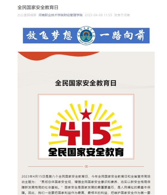 为了使国家安全教育主题活动更有时效性和针对性,财经管理学院利用线上和线下相结合的方式,在微信公众号上推送国家安全的相关知识和要求,并制作海报,面向我院学生宣传国家安全日,要求全体学生在4月15日观看全民国家安全教育日直播活动。同时,我院辅导员也召开了国家安全教育日主题班会,进一步提升学生的国家安全意识。为了使主题教育活动更生动,我院制作了国家安全教育知识视频,以视频的形式宣传国家安全知识相关内容,达到教育活动的目的性和和成效性。
