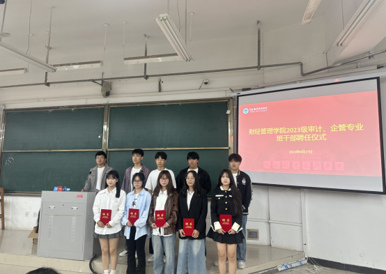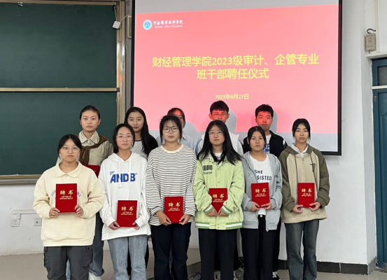 “奋斗是青春最亮丽的底色”。为了更好地带动班级文化建设,树立优良学风,建设优秀的班集体,我院于9月27日在1101教室举办了2023级大数据与审计专业与工商企业管理专业班委聘任仪式。辅导员许明昊老师及2023级审计、企管全体学生参与了此次大会。