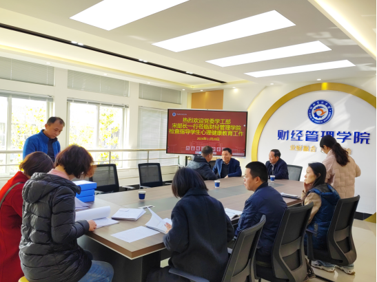 11月20日,校党委学工部部长宋东方、副部长陈昕志、心理咨询中心温娟娟等一行4人莅临财经管理学院检查指导学生心理健康教育工作,学院党总支书记马金伟、副书记余湾、团总支书记张文龙和新生辅导员参加了检查工作。