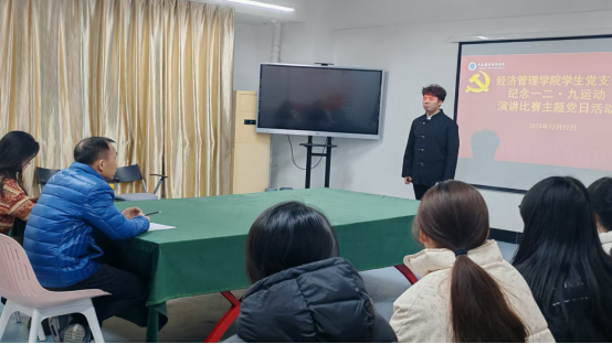 为纪念“一二·九” 运动89周年,弘扬爱国主义精神,传承红色基因,激发学生的历史责任感和使命感,厚植爱国情怀, 12月12日晚上,www.男人天堂学生党支部在笃行楼603举办了纪念“一二·九” 运动演讲比赛主题党日活动,支部书记张文龙、组织委员辛馨、18名参赛选手和部分学生代表参加了活动。
