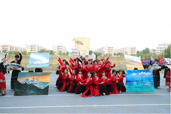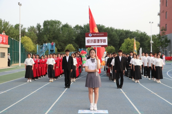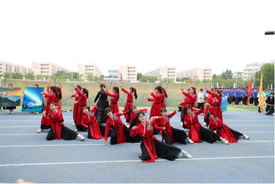 随着入场式的开始,伴随着铿锵的鼓点,学院63名学子组成的方阵迈着整齐的步伐步入会场。方阵成员身着马面裙、古典舞蹈裙和中山装,手持舞蹈扇,伴随着《山河图》音乐的响起,为全校师生上演了精彩绝伦的国风爵士舞蹈。60 名舞者呈“层峦叠嶂”队形深蹲,手臂如毛笔挥毫般划出优美弧线,领舞身以爵士定点动作“抓取”空中虚拟的“山河卷轴”,宽袖甩动间勾勒出黄河九曲轮廓。当音乐进入尾声,全体舞者突然静止,以“山河社稷”造型定格 —— 前排舞者半跪撑地形成“山川基座”,后排学生高举山河画卷卷轴,将“传统底色”与“商科锋芒”熔铸为永恒的青春剪影。
