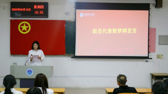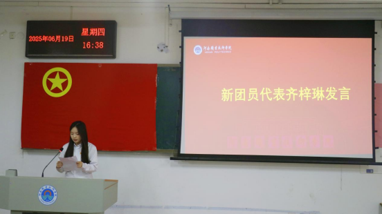 随后,新团员代表齐梓琳代表新团员发言,她表示加入共青团是一份荣誉,更是一份责任。在今后的学习和生活中,将以团员的标准严格要求自己,努力学习科学文化知识,积极参加社会实践活动,用实际行动践行入团誓言,为团旗增光添彩。老团员代表郭梦婷同学也分享了自己的成长经历,鼓励新团员们珍惜团员身份,不断提升自我,在青春的赛道上奋力奔跑,为学院发展贡献自己的力量。