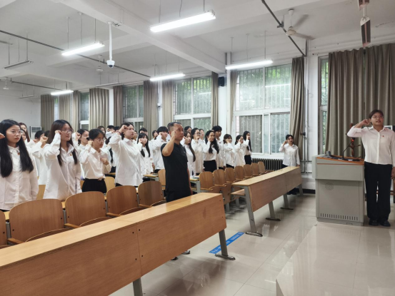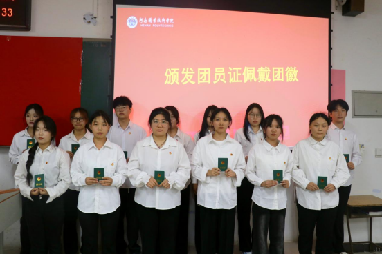 在热烈的掌声中,各班团支书为新团员佩戴团徽徽章,一枚枚熠熠生辉的团徽,不仅是共青团员身份的象征,更承载着责任与担当。接下来,全体新团员面向团旗庄严宣誓,铮铮誓言,铿锵有力,响彻整个会场,表达了新团员们对共青团组织的无限向往和为共青团事业不懈奋斗的坚定决心。